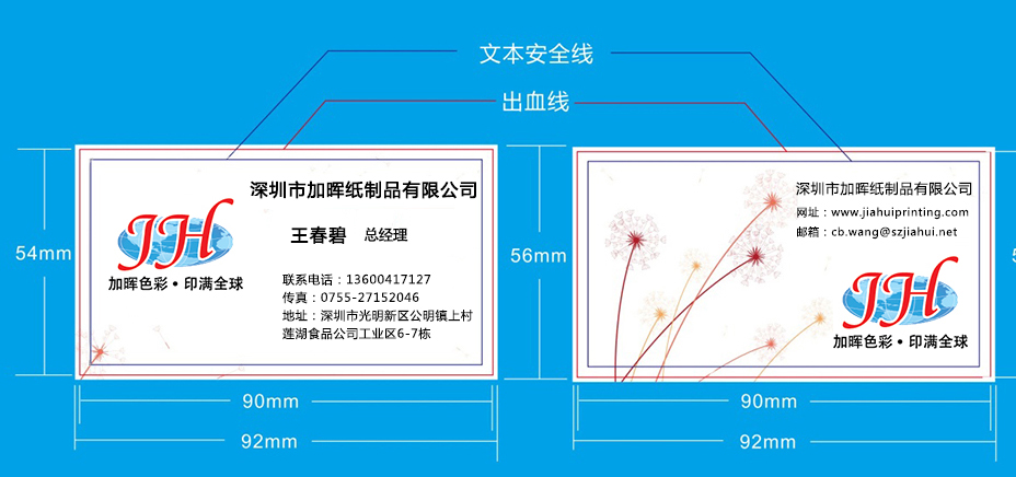 文件尺寸: 名片成品尺寸為:54×90mm,則印刷文件尺寸需為:56x92mm名片設計稿件需在圖片上下左右各添加1mm出血;也支持名片成品尺寸為50x90mm、45x90mm的印刷,此時您的印刷文件尺寸需為52x92mm、47x92mm(名片設計稿件需在圖片上下左右各添加1mm出血)。為避免裁切誤差,文字信息或內(nèi)容需置于距離圖片邊緣3mm以上。如果提供的文件尺寸非上述標準尺寸,且誤差在1毫米內(nèi),將按接近的標準尺寸印刷